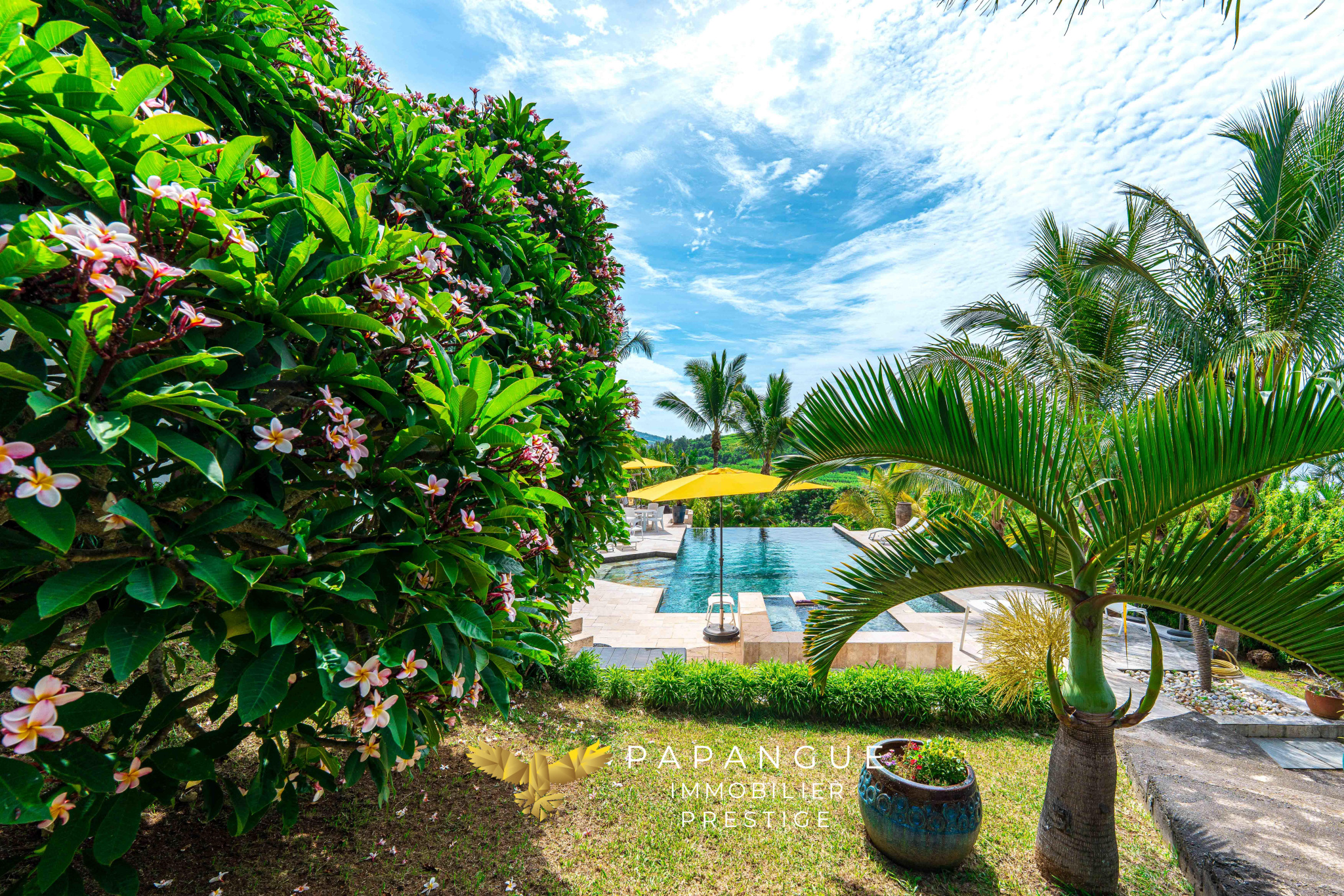 Au coeur de ce havre de paix, la villa développe plus de 220 m2 habitables, auxquels s’ajoutent varangues et annexes, assurant une parfaite continuité entre intérieur et extérieur. La vaste plage de piscine de plus de 100 m2, réalisée avec des matériaux nobles, s’intègre harmonieusement dans le paysage et s’accompagne d’une vue à couper le souffle.