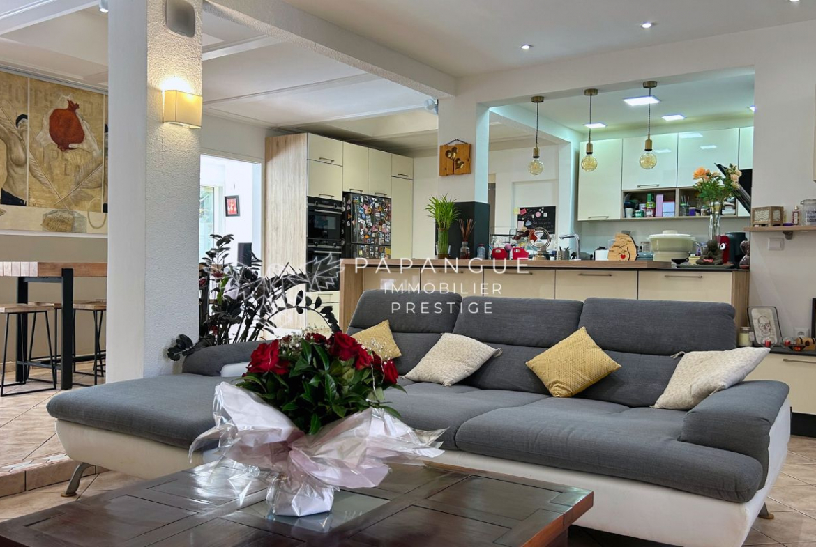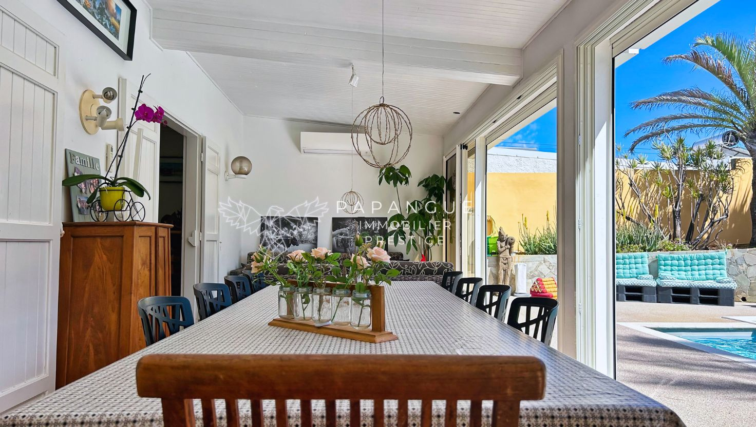 D’une surface habitable de 185 m2, la maison s’organise autour d’une vaste pièce de vie lumineuse, prolongée par une varangue fermée en véranda, dotée de baies vitrées à galandage, créant une continuité harmonieuse vers le jardin arboré et la piscine.