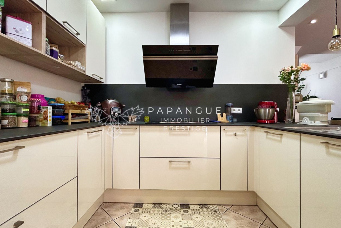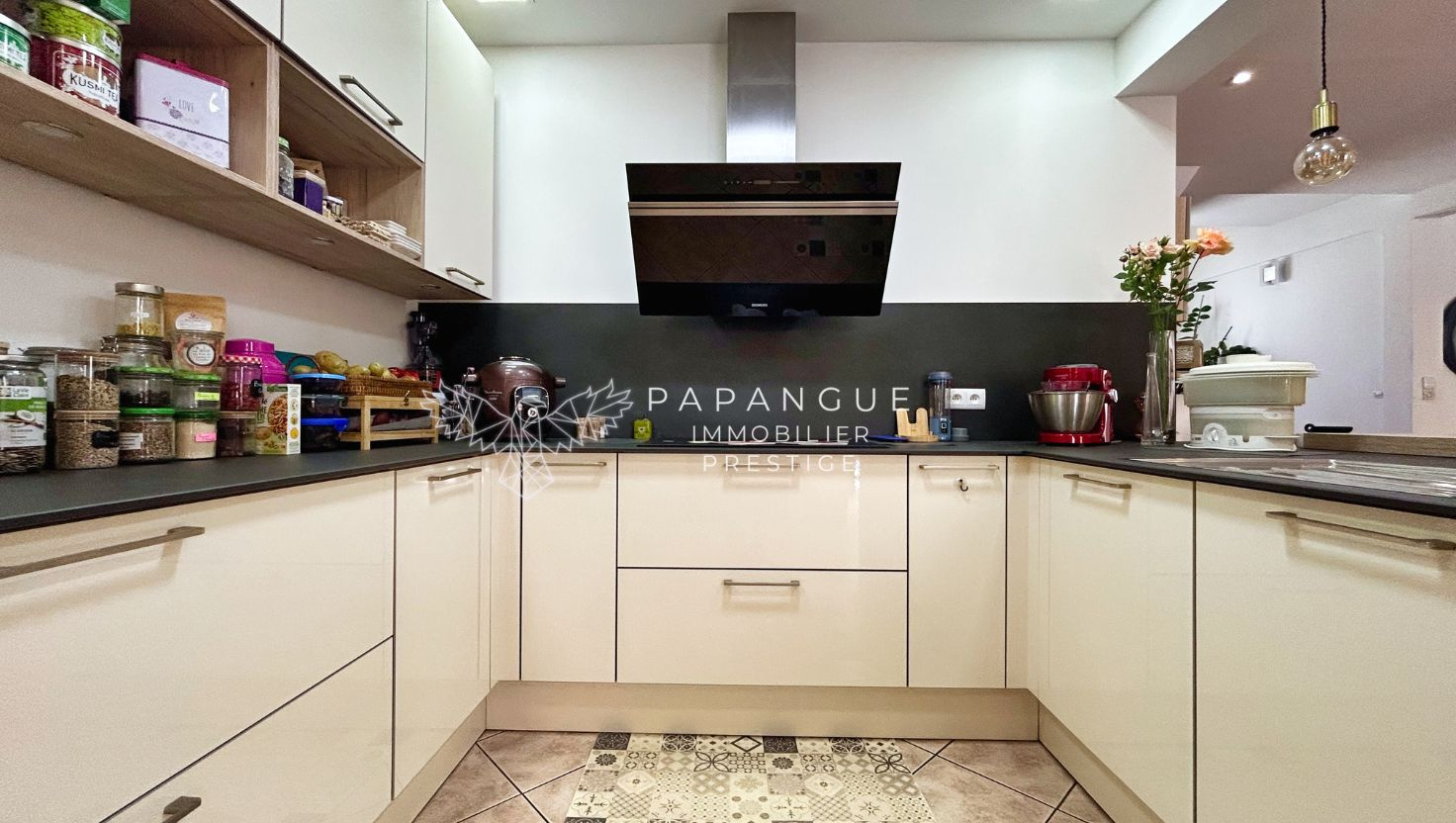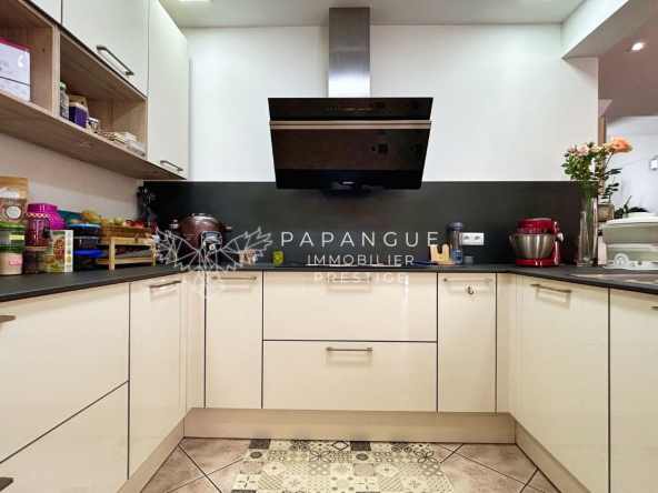 La cuisine ouverte, sobre et conviviale, s’intègre parfaitement à cet espace de vie pensé pour recevoir et partager.