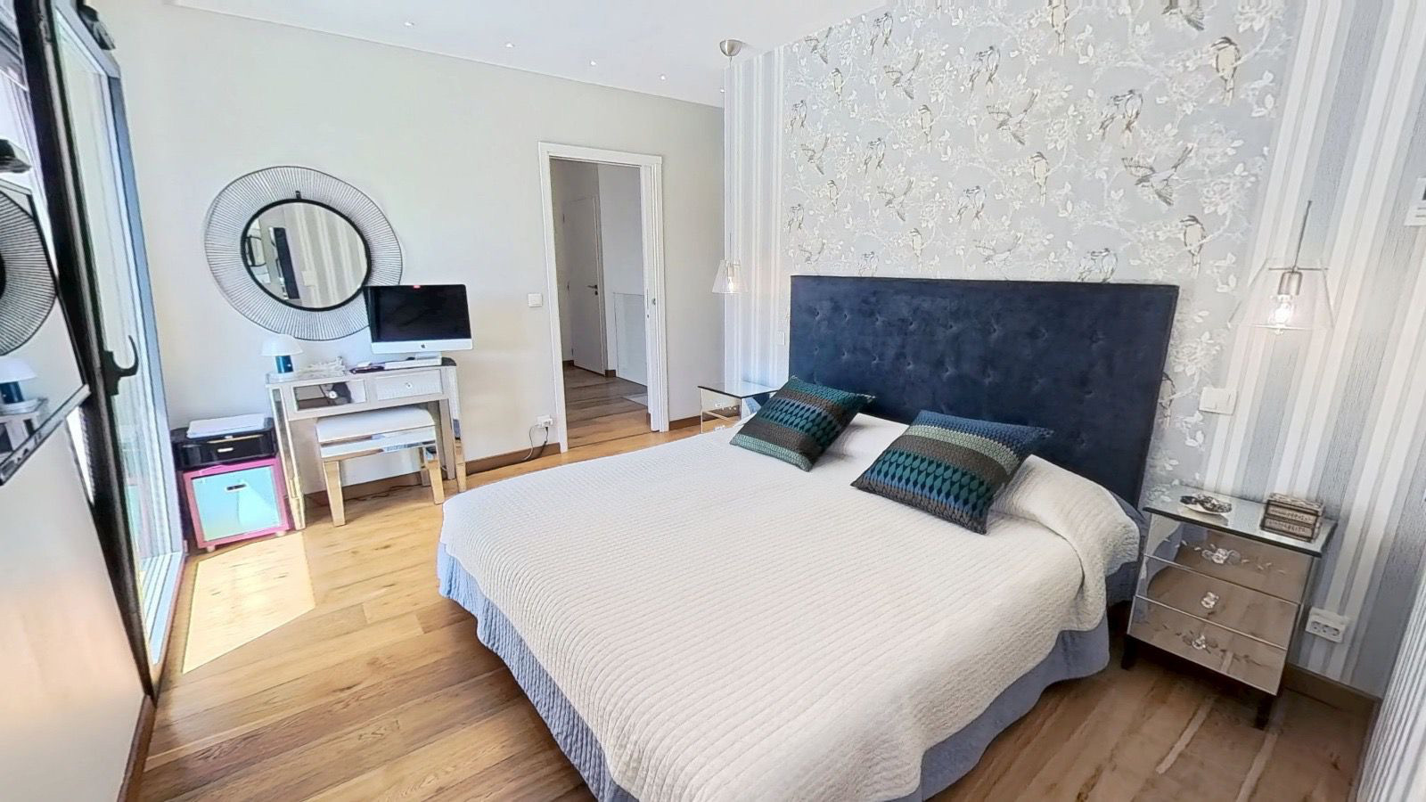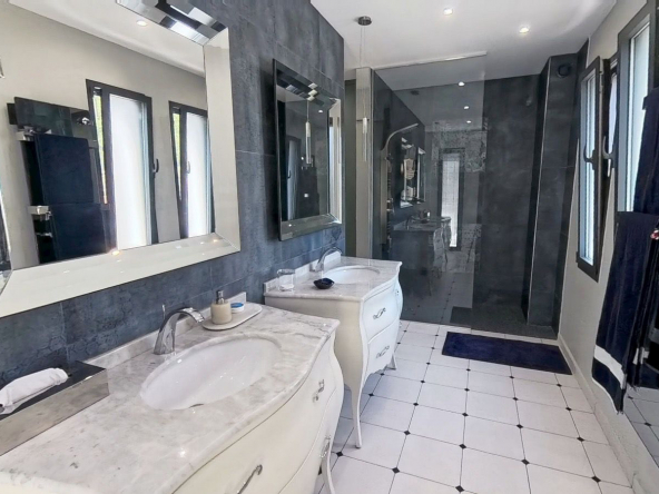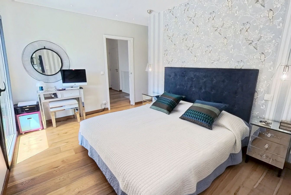À l’étage, la villa réserve de beaux espaces nuit : une master suite d’exception de 33 m2 avec dressing, salle de bains raffinée et balcon privatif de 7 m2, une chambre lumineuse, un bureau (ou chambre d’enfant), ainsi qu’une salle de bains contemporaine et un WC indépendant. La hauteur sous plafond de 2,50 m renforce le confort et la luminosité de l’ensemble.