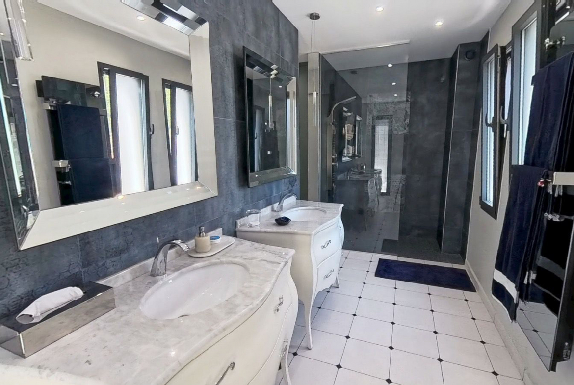 À l’extérieur, l’art de vivre méditerranéen s’impose : une piscine élégante de 9 x 4 m s’intègre parfaitement dans le jardin arboré, tandis que la pergola bioclimatique de 29 m2 et le carport de 16 m2 prolongent les espaces de détente. Le jardin paysager, orné d’oliviers, compose un cadre rare et authentique, où règnent calme et intimité. Un parking extérieur accueille jusqu’à 8 véhicules, en complément du garage fermé.
