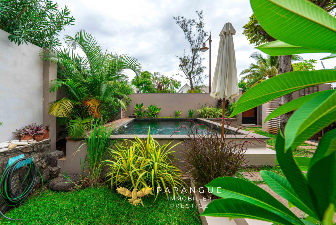 Le jardin luxuriant accueille une piscine élégamment intégrée, véritable coeur de la propriété, propice à la détente et aux instants suspendus.
