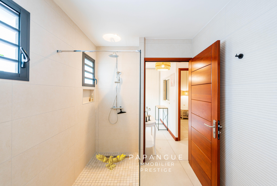Au rez-de-chaussée, un espace de vie lumineux s’ouvre sur une large varangue, invitant à la douceur des journées en plein air. Une chambre et une salle d’eau extérieure complètent cet espace, dans un esprit authentique et raffiné.
