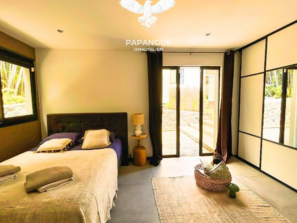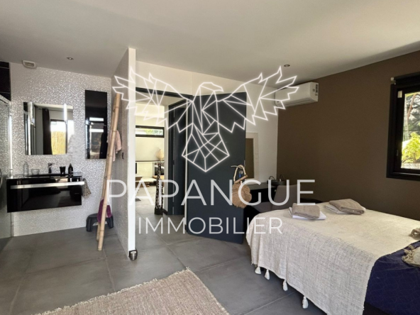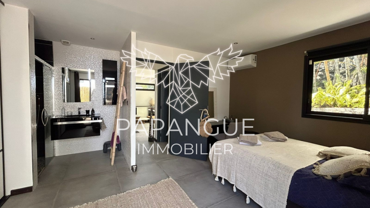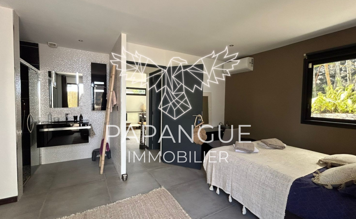 L’espace de vie, spacieux et lumineux, s’ouvre sur une vaste varangue, véritable extension du salon, offrant ainsi un cadre de vie inégalable. La cuisine, entièrement équipée et aménagée avec soin, dispose également d’une buanderie. L’espace nuit se compose de quatre chambres, dont deux suites parentales, ainsi qu’une somptueuse master bedroom avec vue directe sur le jardin et la piscine. Deux vastes dressings viennent parfaire cette suite parentale. Une salle de bains supplémentaire complète l’espace nuit.