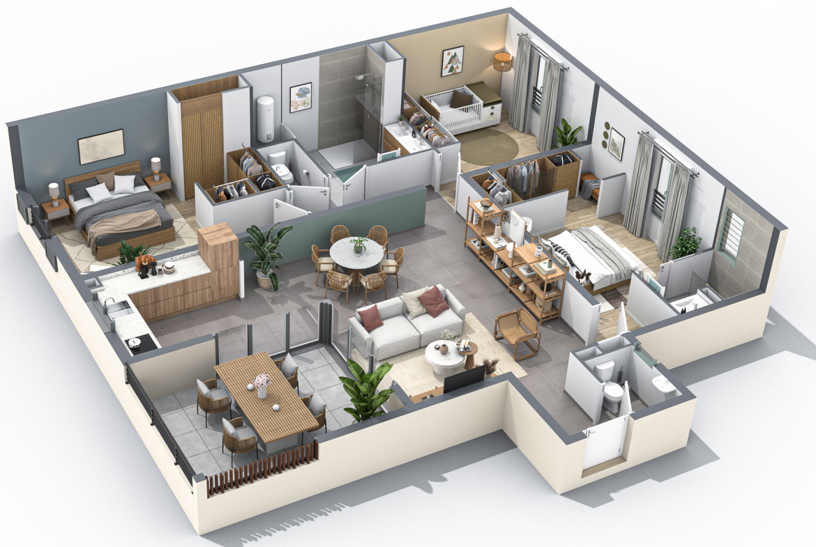 Les T3 et T4 se distinguent par leurs volumes traversants, leurs varangues ouvertes sur la ville et leurs prestations de qualité supérieure. Les T3, à partir de 666 000 EUR TTC, offrent près de 100 m2 utiles, un bel espace de vie et un stationnement privatif. Les T4, entre 745 000 EUR et 796 000 EUR TTC, séduisent par leurs proportions dignes d’un appartement-villa : plus de 110 m2 utiles, deux parkings, une varangue spacieuse et une conception contemporaine aux lignes épurées.