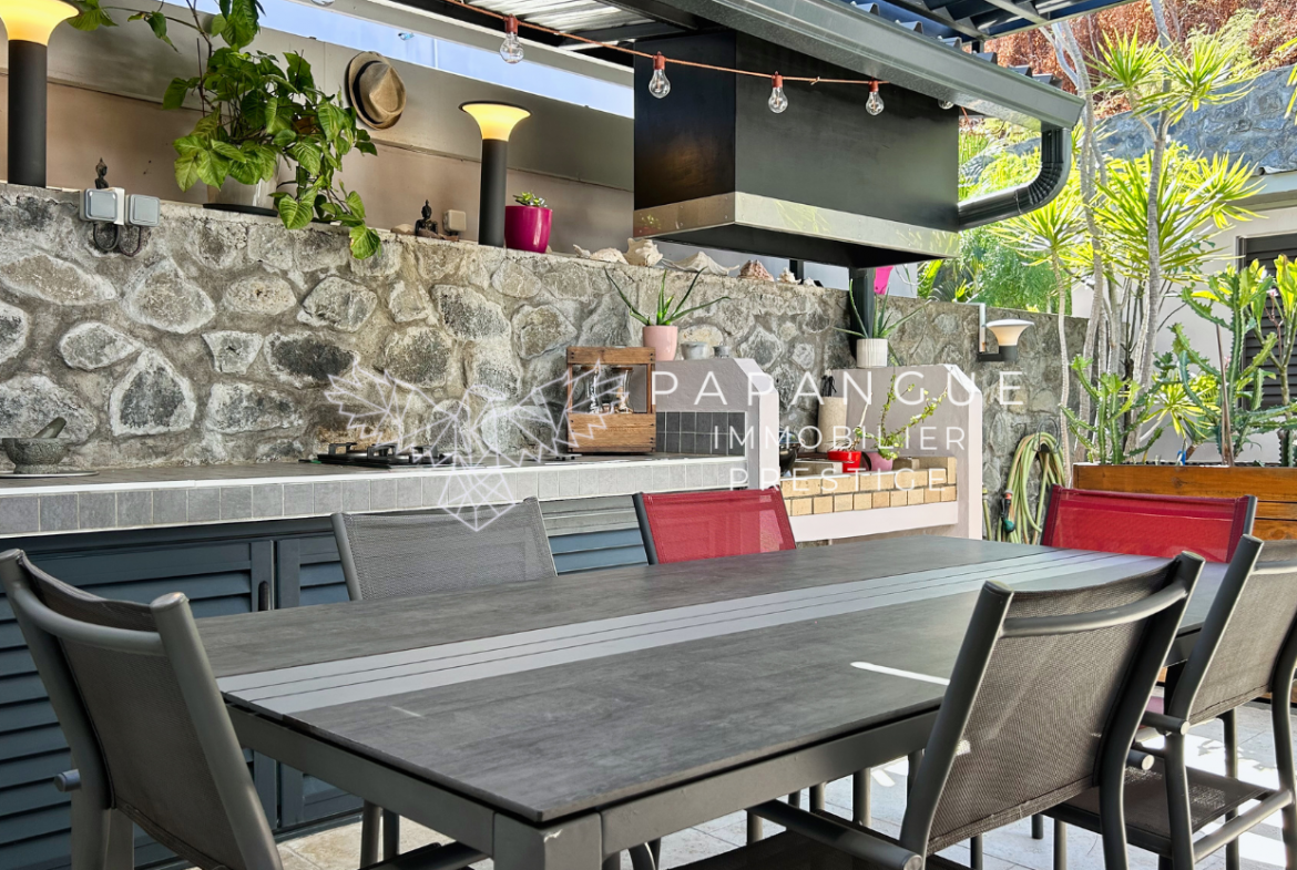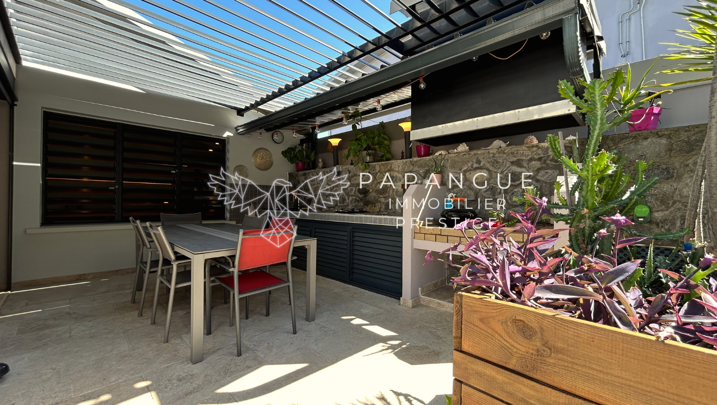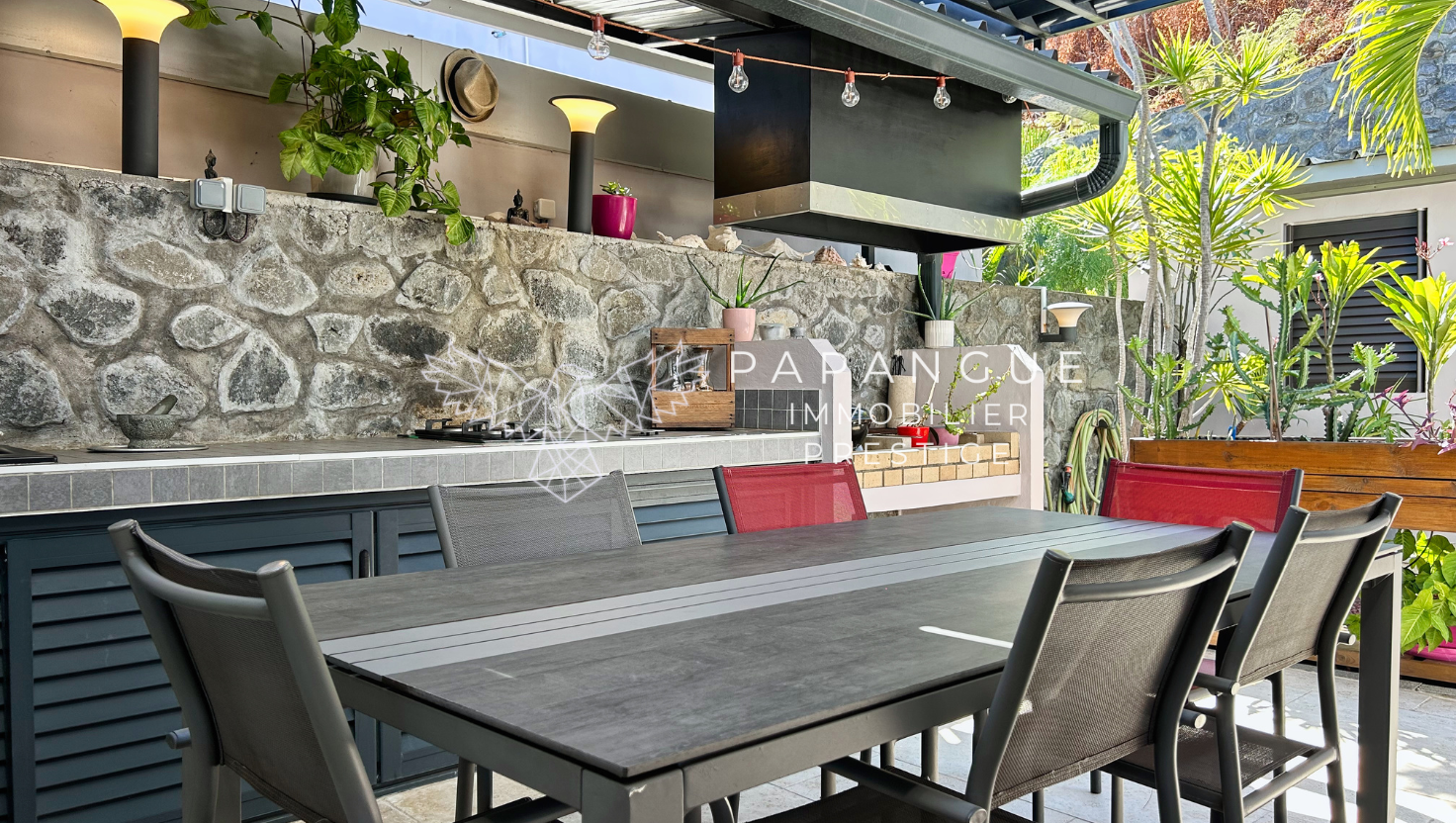 Le séjour lumineux, ouvert par de vastes baies vitrées à galandage, conjugue confort et raffinement, sublimé par le travertin et la pierre naturelle. La cuisine moderne et ouverte complète harmonieusement cet espace chaleureux, tandis qu’à l’extérieur, une salle à manger et une cuisine d’été prolongent les moments conviviaux dans la douceur des soirées tropicales du centre-ville de Saint-Leu.