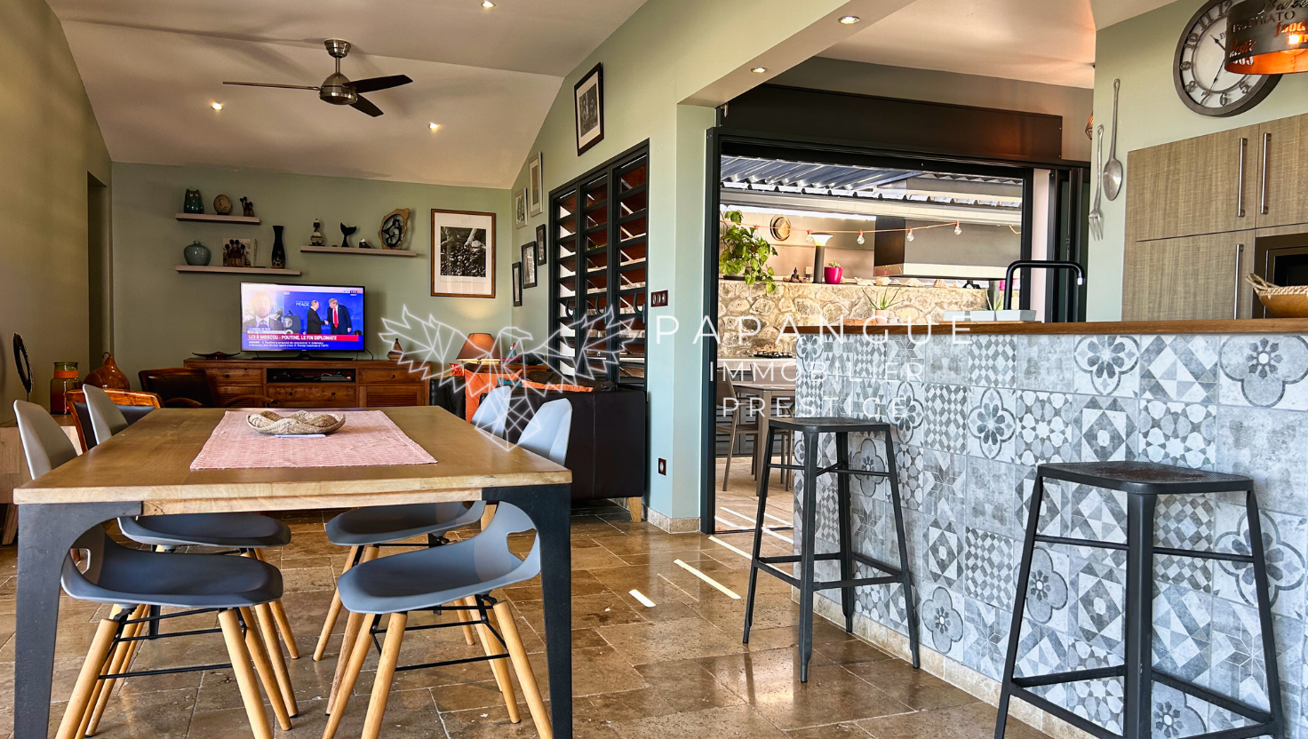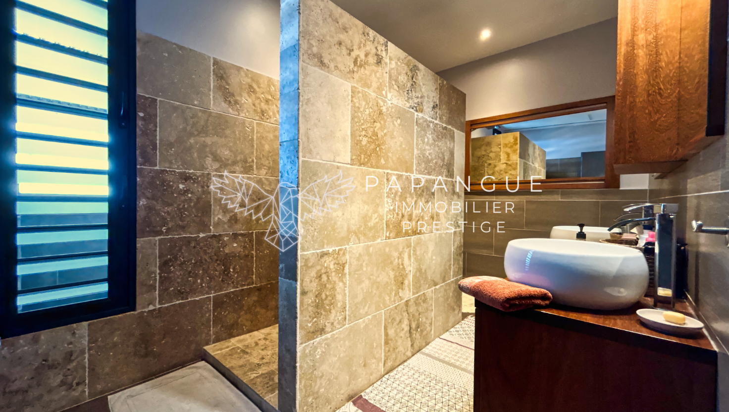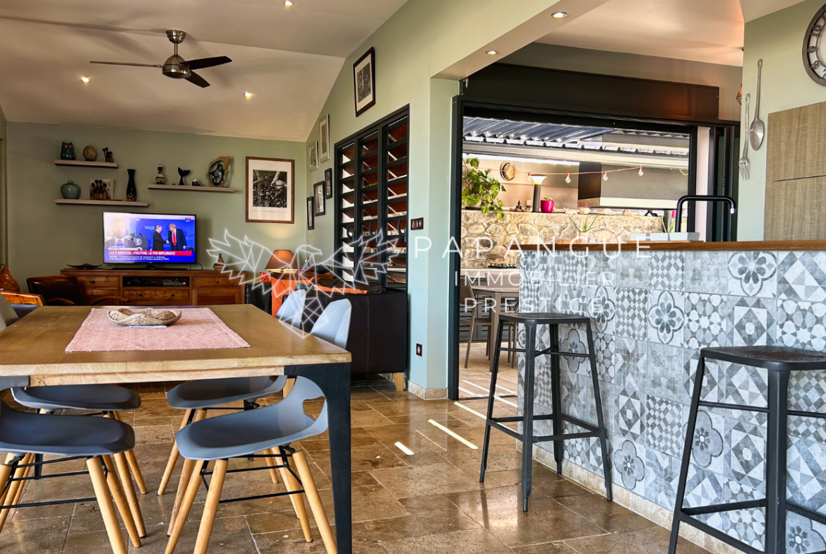 Le séjour lumineux, ouvert par de vastes baies vitrées à galandage, conjugue confort et raffinement, sublimé par le travertin et la pierre naturelle. La cuisine moderne et ouverte complète harmonieusement cet espace chaleureux, tandis qu’à l’extérieur, une salle à manger et une cuisine d’été prolongent les moments conviviaux dans la douceur des soirées tropicales du centre-ville de Saint-Leu.