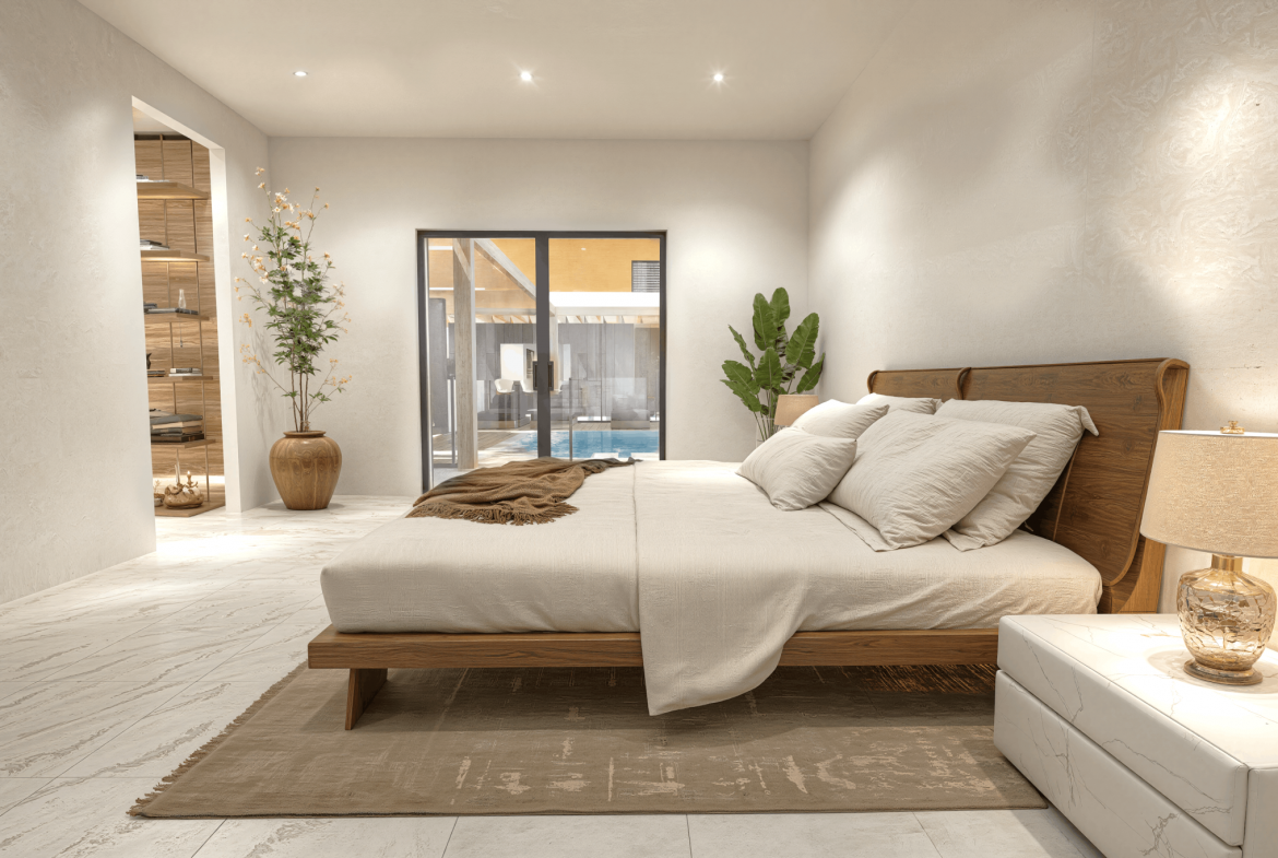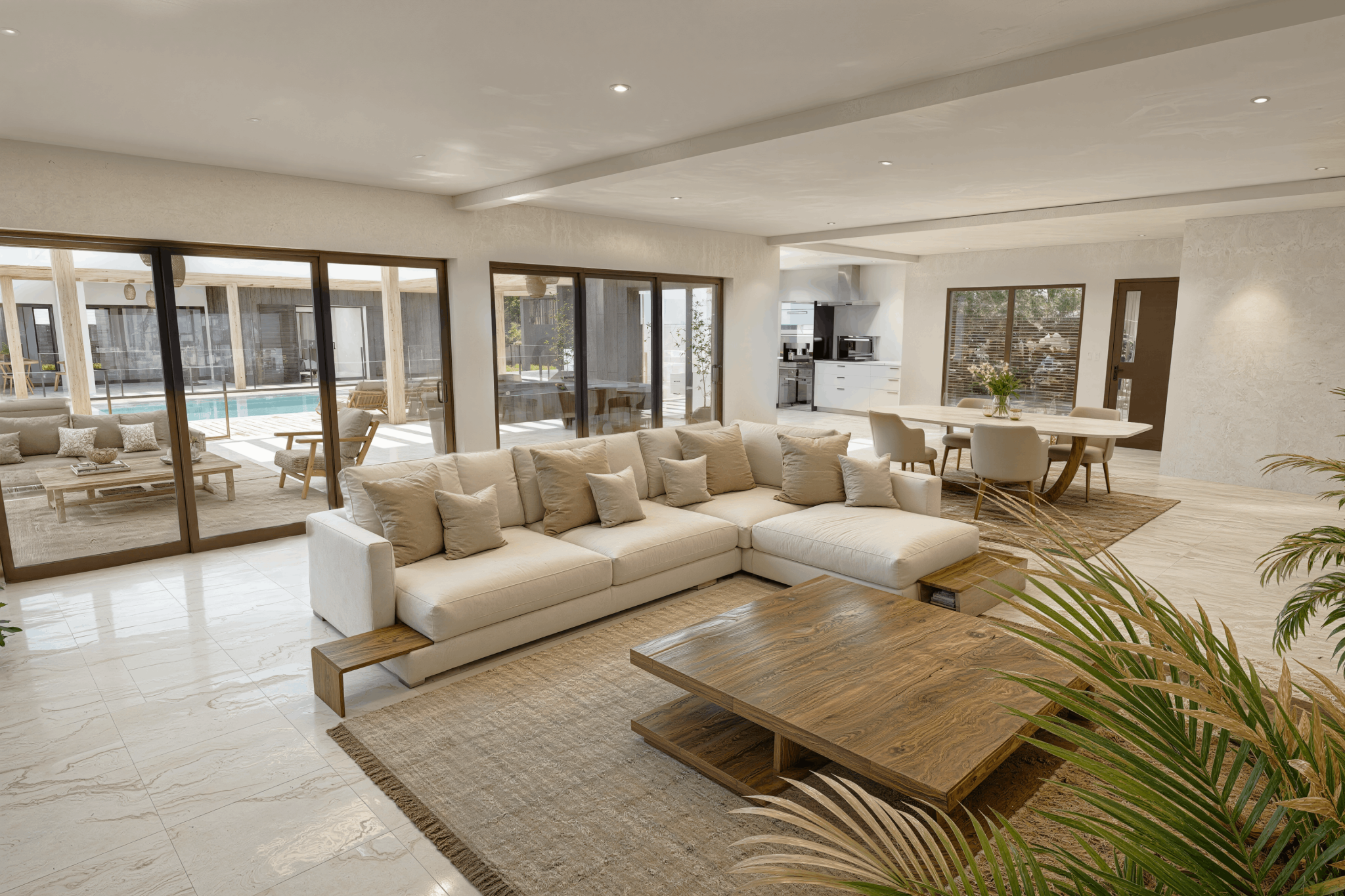 La pièce de vie, d’environ 71 m2, devient le coeur de la maison, baignée de soleil, tournée vers les terrasses et la piscine miroir centrale de 9 x 4,50 mètres. Un lieu pensé pour partager, recevoir, se détendre, où chaque instant se vit au rythme de la lumière et du climat doux de l’Hermitage.