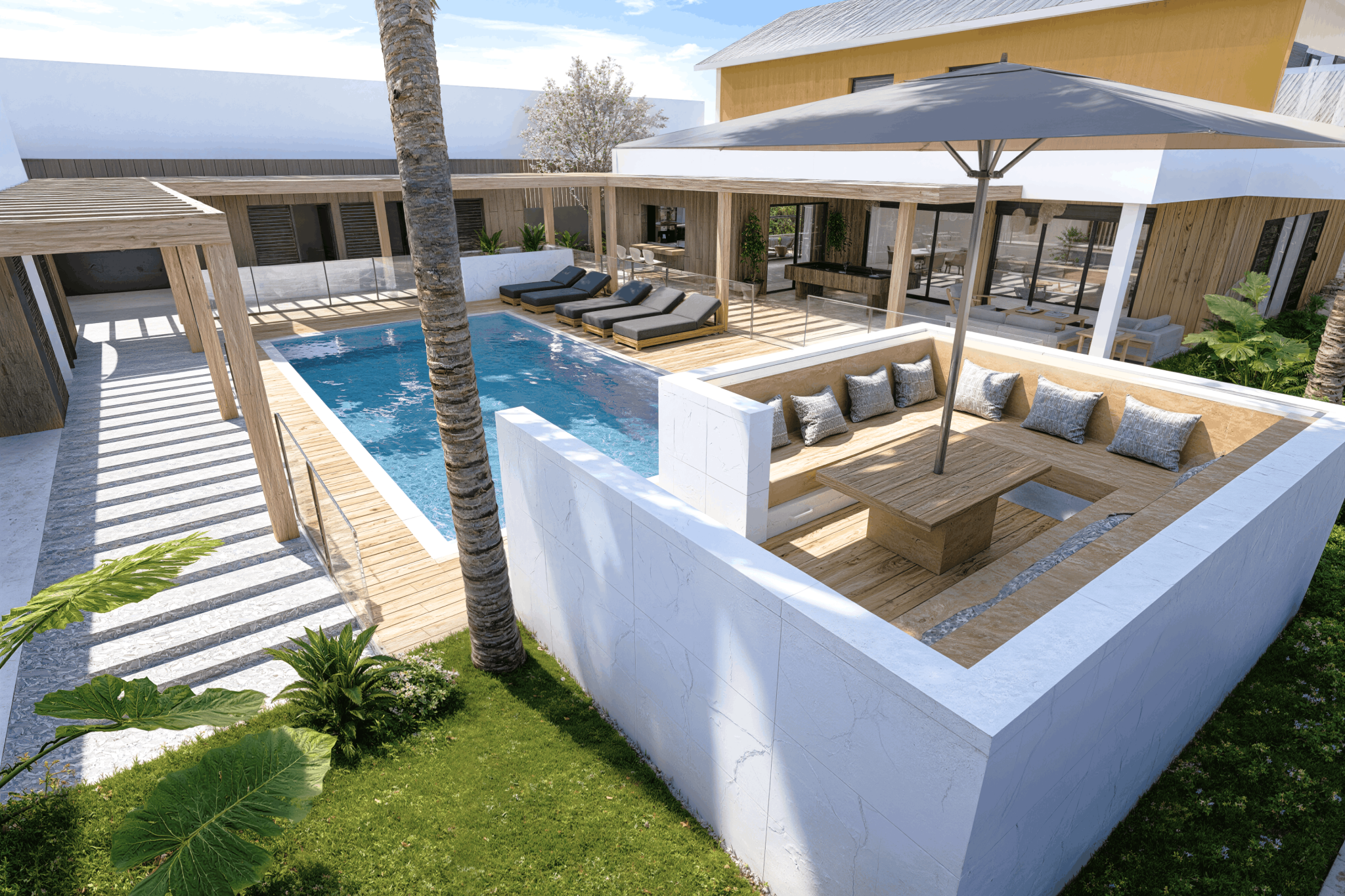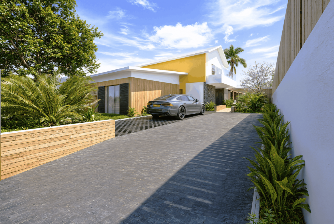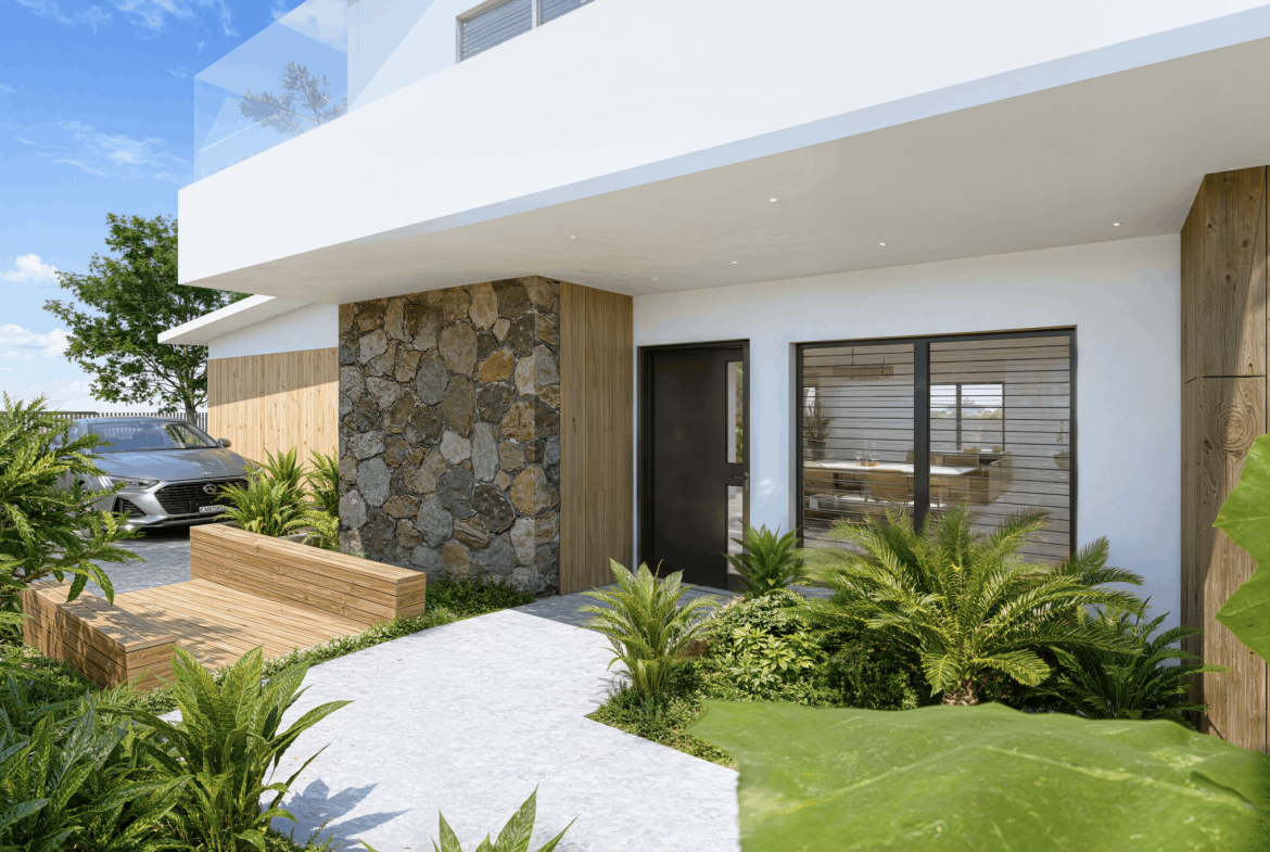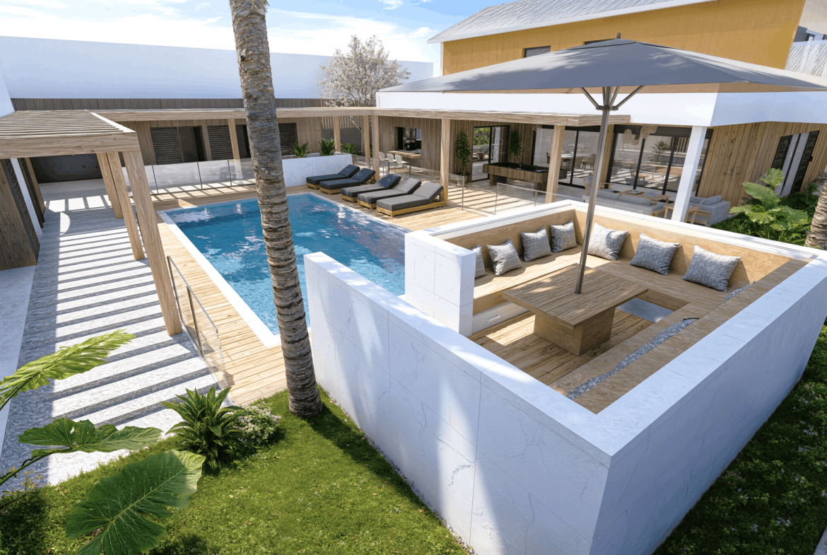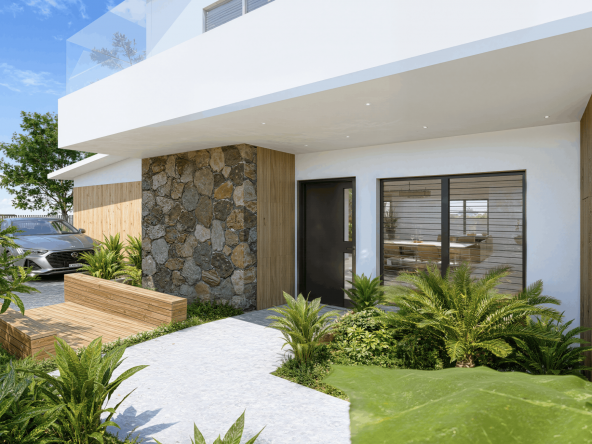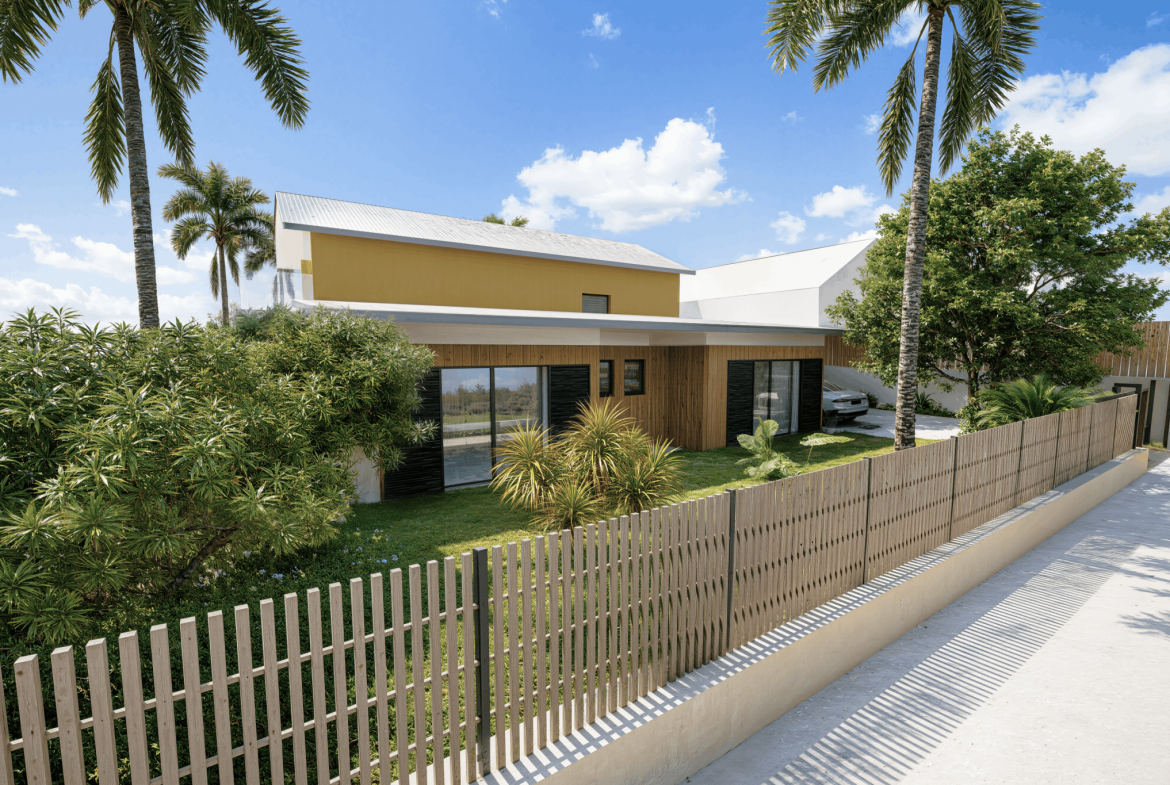 Implantée sur un terrain de 1 154 m2, cette villa neuve développe 353 m2 de surface de plancher et s’inscrit dans une architecture contemporaine aux lignes épurées, parfaitement intégrée à son environnement tropical. Dès l’entrée, les volumes s’ouvrent, la lumière circule librement, portée par de larges baies vitrées qui effacent la frontière entre intérieur et extérieur.