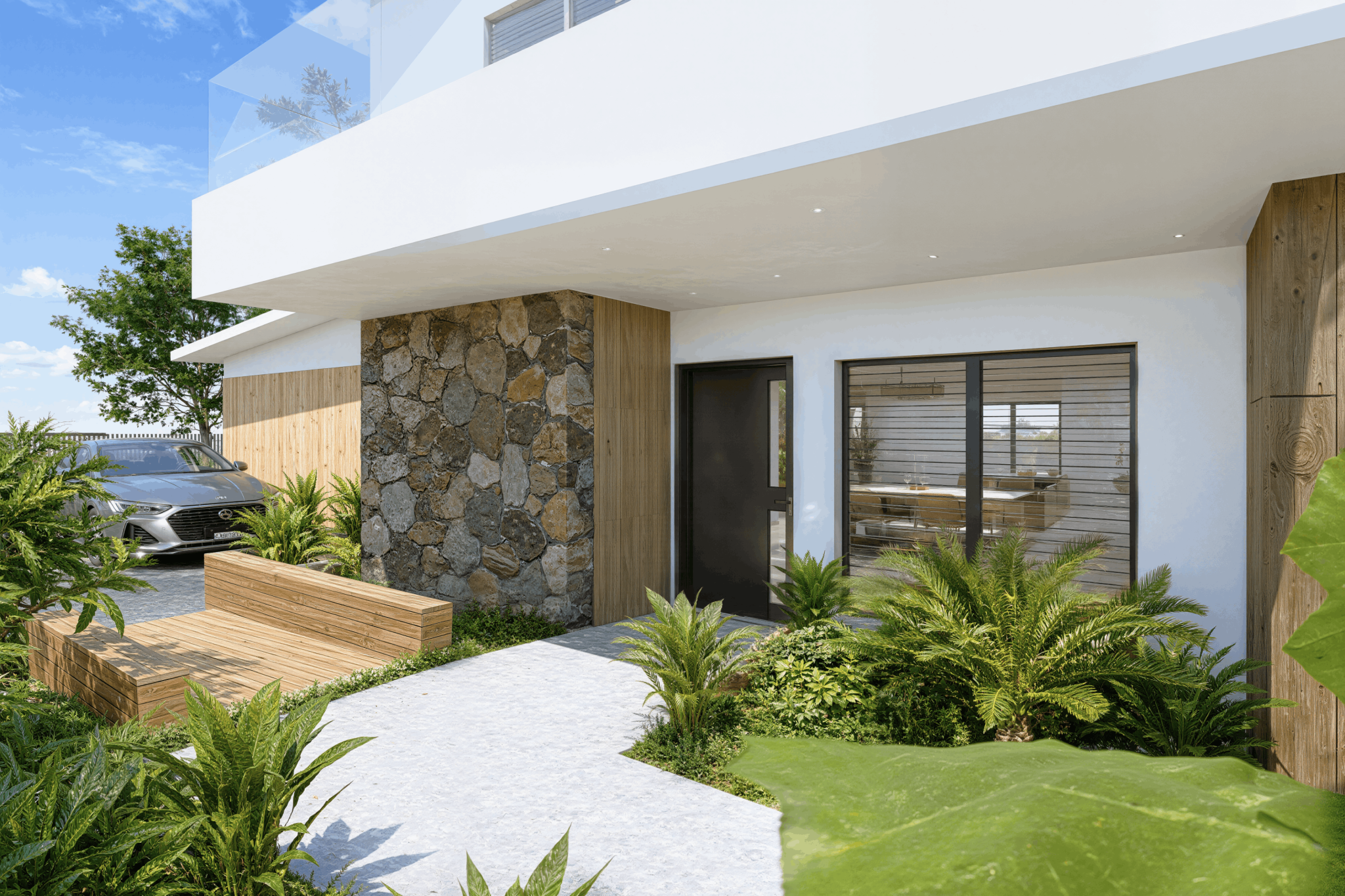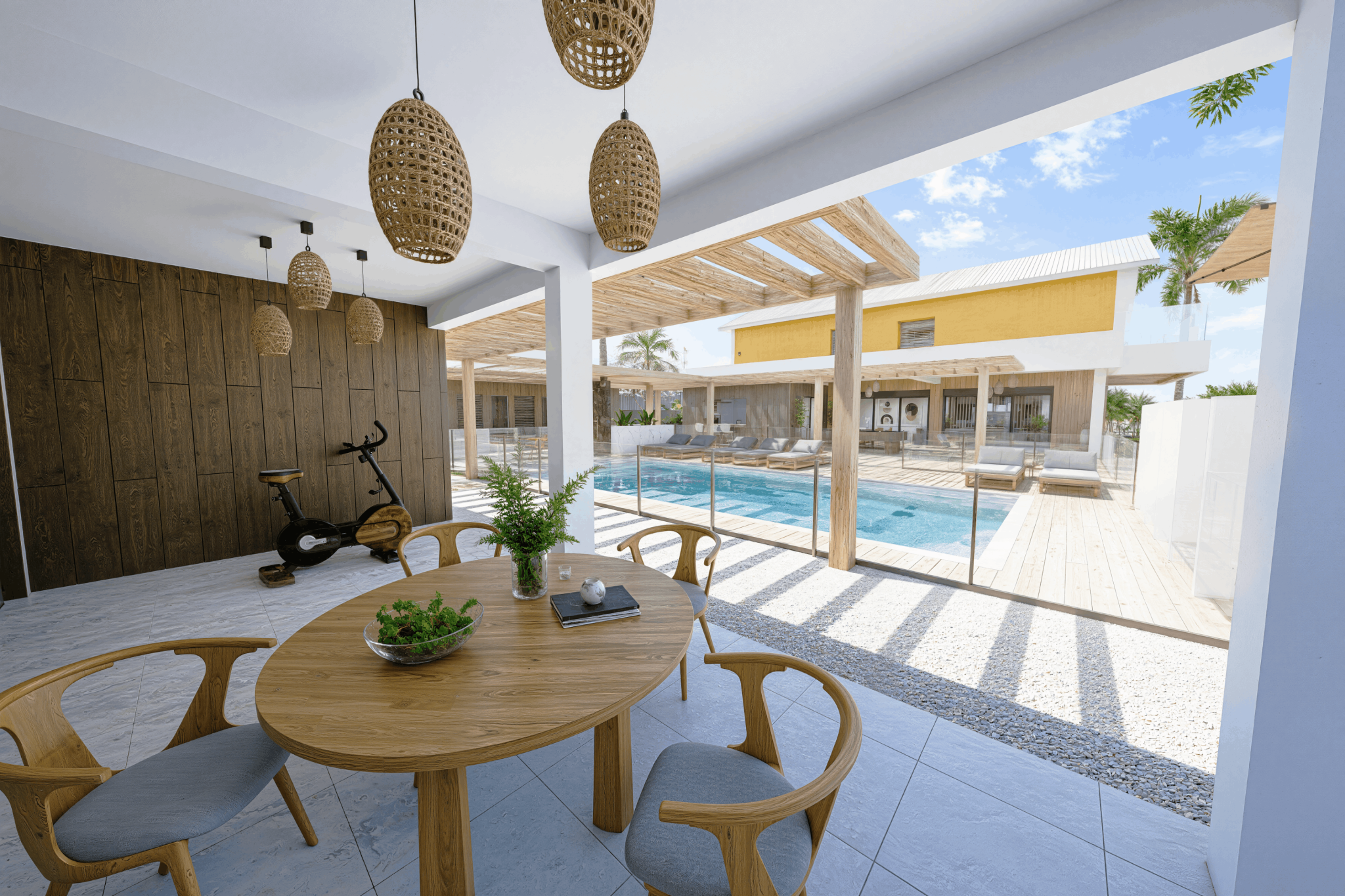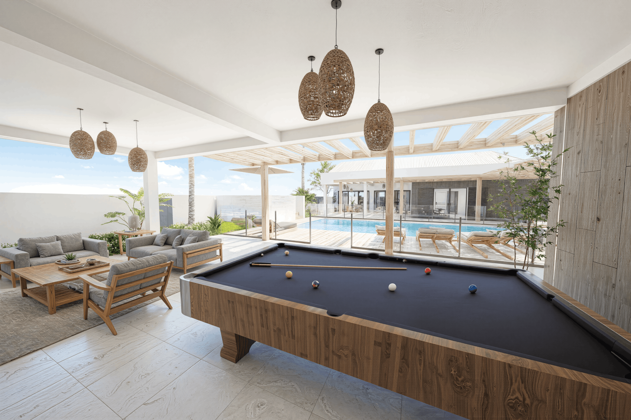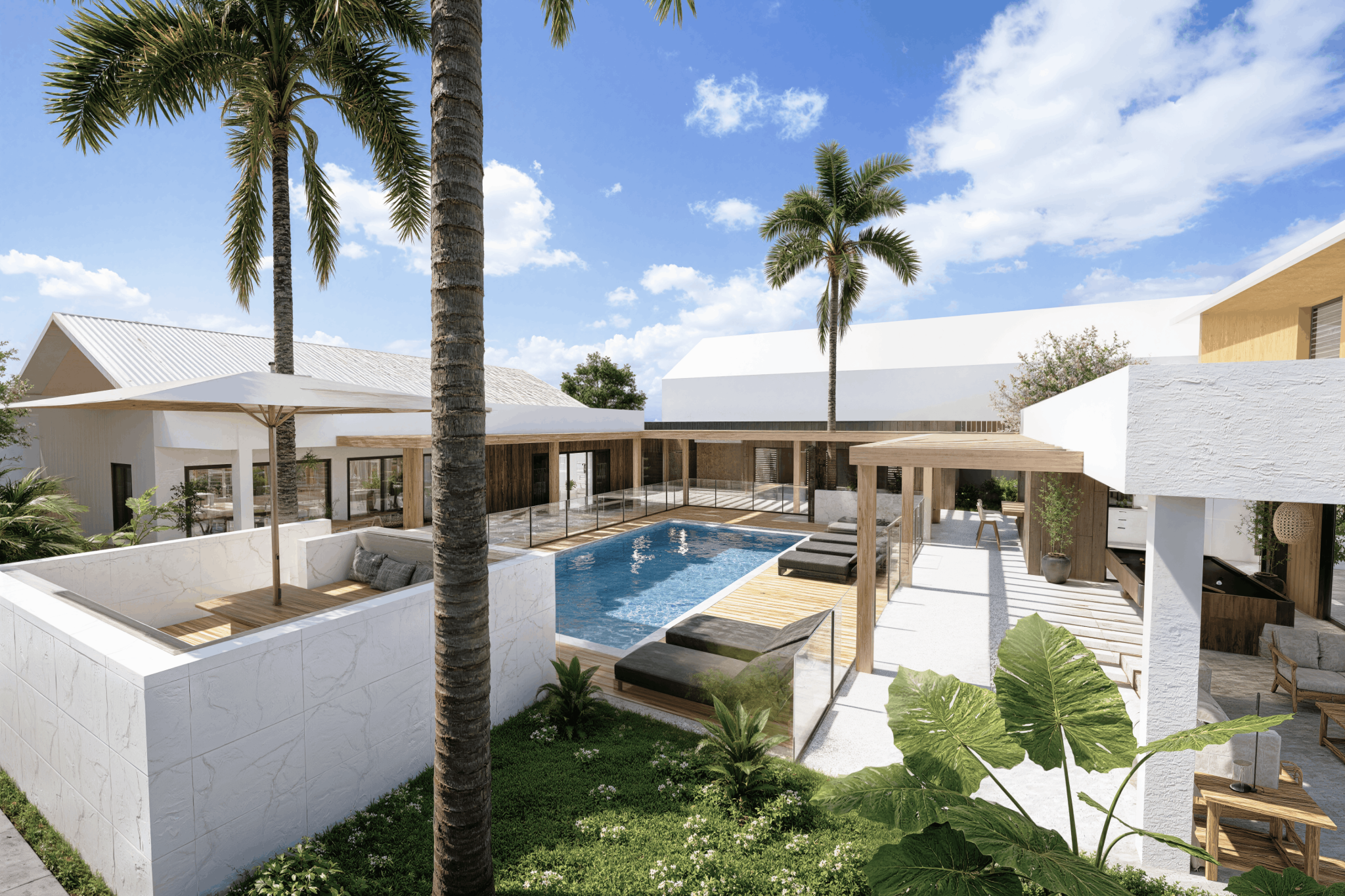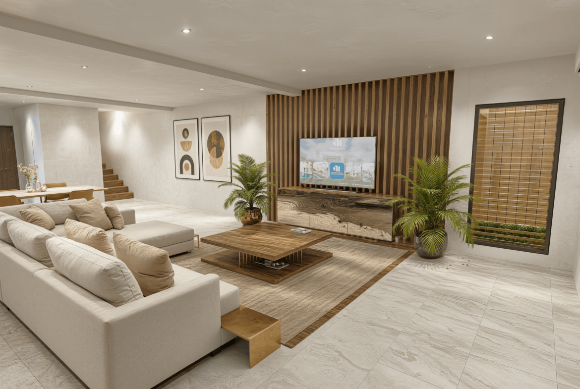 Implantée sur un terrain de 1 154 m2, cette villa neuve développe 353 m2 de surface de plancher et s’inscrit dans une architecture contemporaine aux lignes épurées, parfaitement intégrée à son environnement tropical. Dès l’entrée, les volumes s’ouvrent, la lumière circule librement, portée par de larges baies vitrées qui effacent la frontière entre intérieur et extérieur.